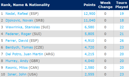 As of April 28, Rafa has 12900 points, while Djokovic’s points remain unchanged at 11040. The difference between them is 1860 points. Djokovic has only 10 points to defend at Madrid. Djokovic could therefore potentially catch up to Rafa in Madrid or later in Rome, but he has to face the King of Clay in his own back yard to do so, and that’s a tall order to fulfill. In the Race to London, Rafa currently stands at No.4, behind Stanislas Wawrinka, Novak Djokovic, and Roger Federer.